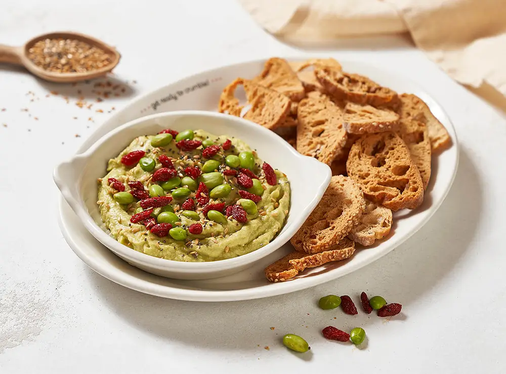 A full-on flavorful mix of avocado, beans, goji berries, flax seeds, edamame, and chia seeds, served with home-baked crostini bread