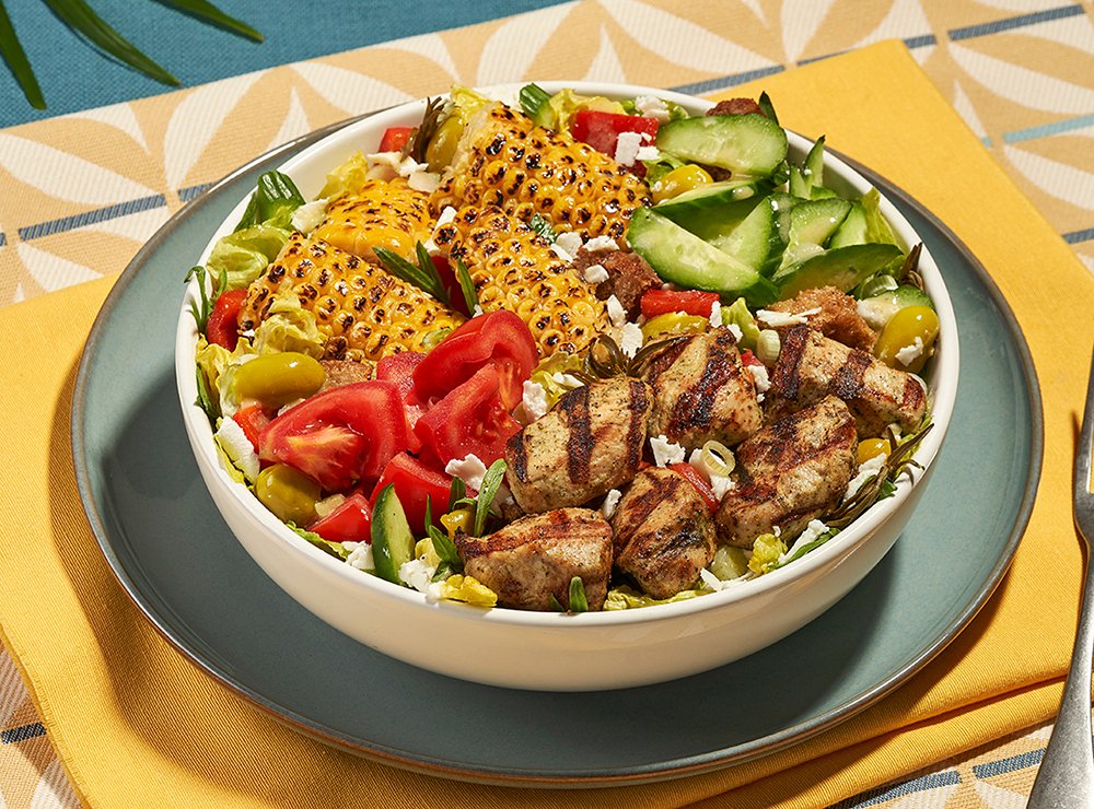Marinated grilled chicken, feta cheese, grilled corn, sucrine lettuce, pickled green zaatar, wild thyme, tomatoes, grilled red bell peppers, croutons, cucumbers, olives and green onions. Served with our lemon oil dressing.
