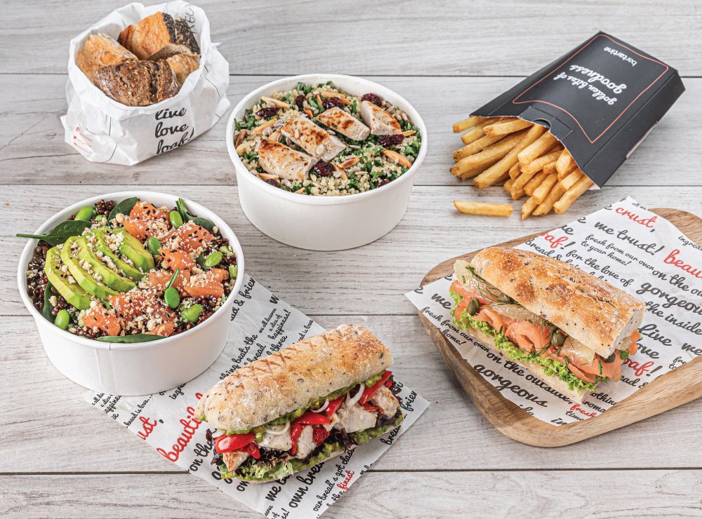 half kale quinoa celebration, half salmon sashimi quinoa, half salmon tartine, half chicken avocado and fries
