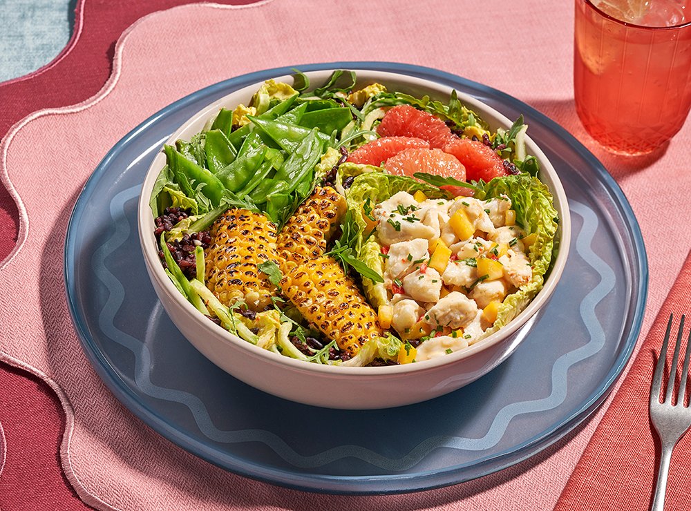 Fresh crab, mango, chives, red chili pepper on a colorful mix of arugula, sucrine lettuce, cucumber and black rice. Tossed with snap peas, grapefruit, grilled corn and our signature sweet and spicy sauce.