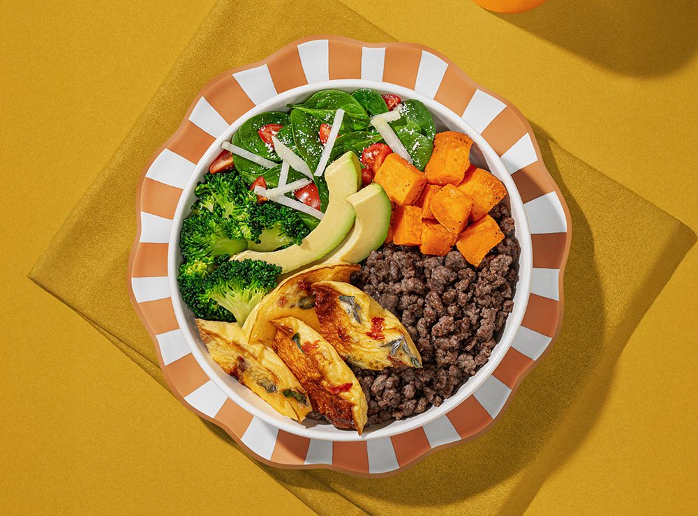 A powerful protein boost of minced beef and baked omelette with wild thyme and sun-dried tomatoes. Served with avocado, sweet potatoes, broccoli, and cherry tomatoes, with a side of fresh baby spinach, crunchy kohlrabi (cromb) and parmesan cheese