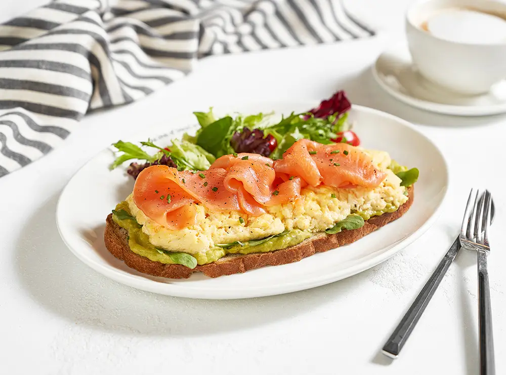 Scrambled eggs with fresh cream, avocado spread, topped with smoked salmon slices, chives, arugula leaves on “pain au levain” served with a side salad.