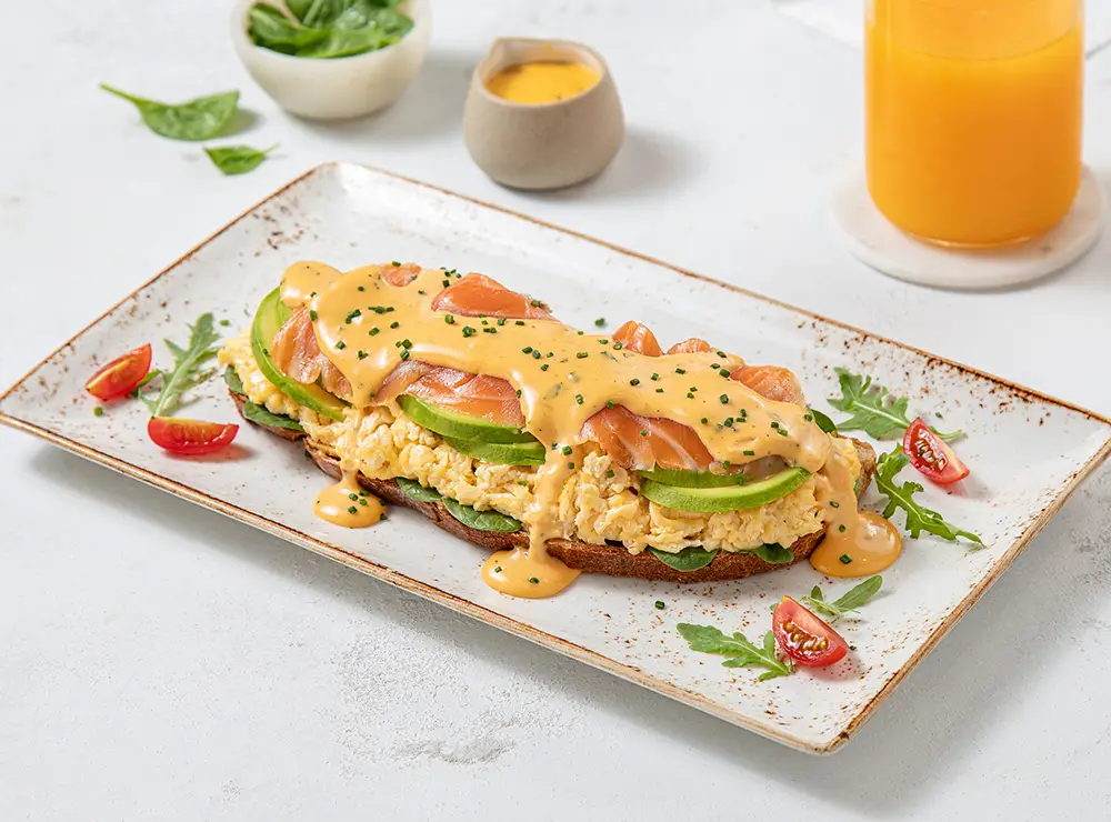Scrambled eggs on toasted sourdough bread, topped with avocado, smoked salmon and baby spinach. Drizzled with hollandaise sauce and sprinkled with fresh chives.