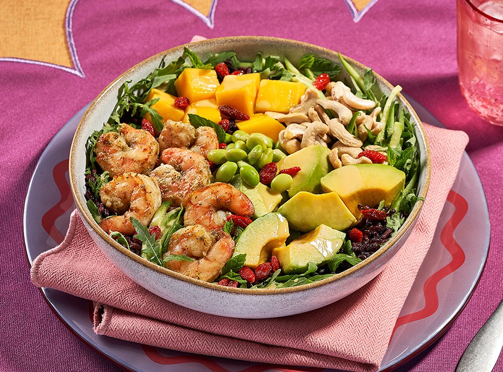 Juicy marinated shrimps on a vibrant mix of arugula, cucumber, mint and black rice. Topped with mango, avocado, cashews, edamame and goji berries. Served with our citrus mustard sauce.