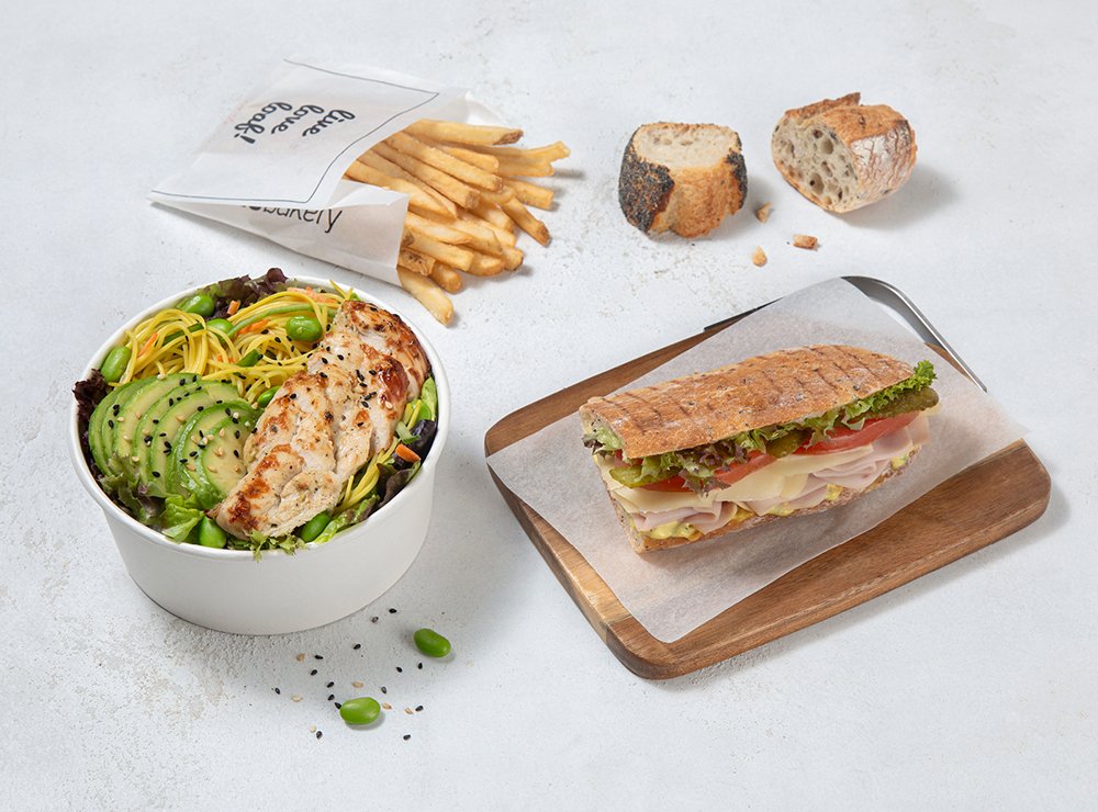 half turkey and cheese, half asian chicken noodles and half fries
